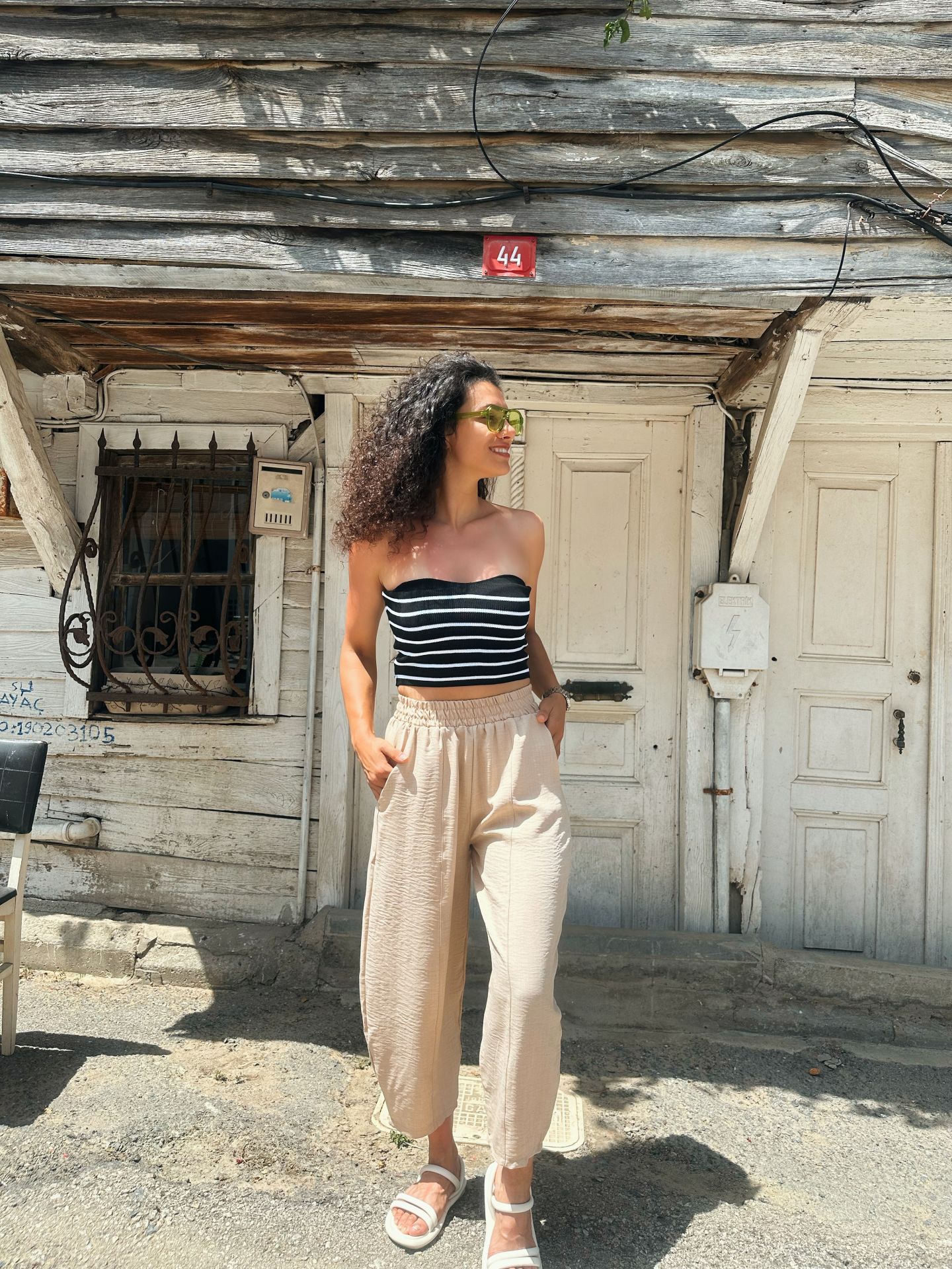 Aerobin kumaş, tiril tiril, şalvar model, yüksek bel pantolon. İki rengi mevcuttur. Belden tam kalıptır.