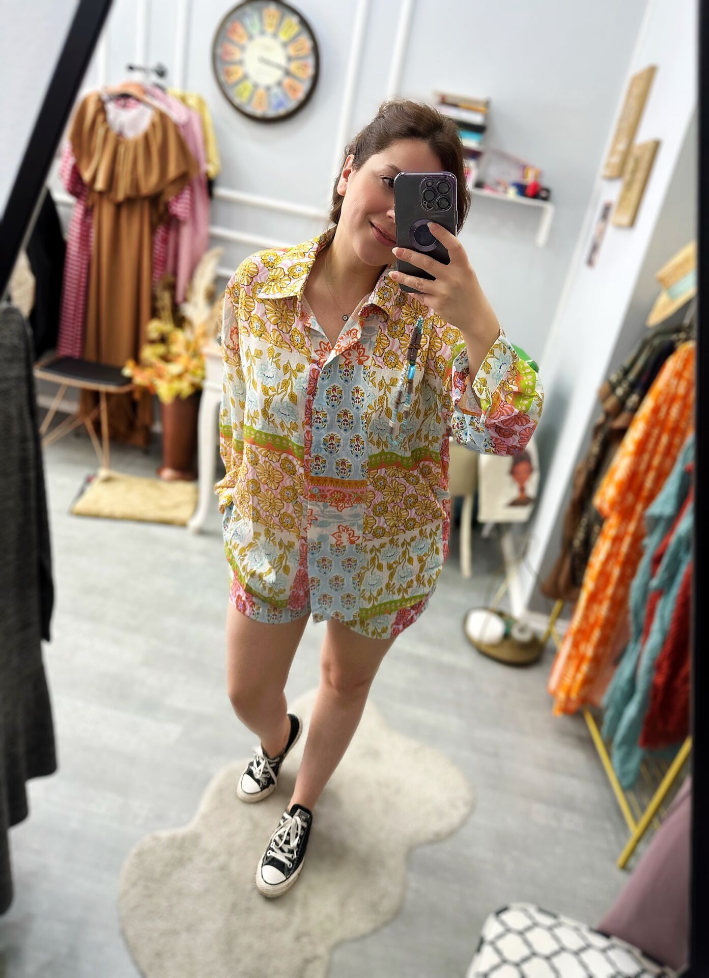 Oversize formda, pamuk keten dokulu, etnik desen, tiril tiril bir takım. Şort ceplidir. Bedeninizi yercih edebilirsiniz.