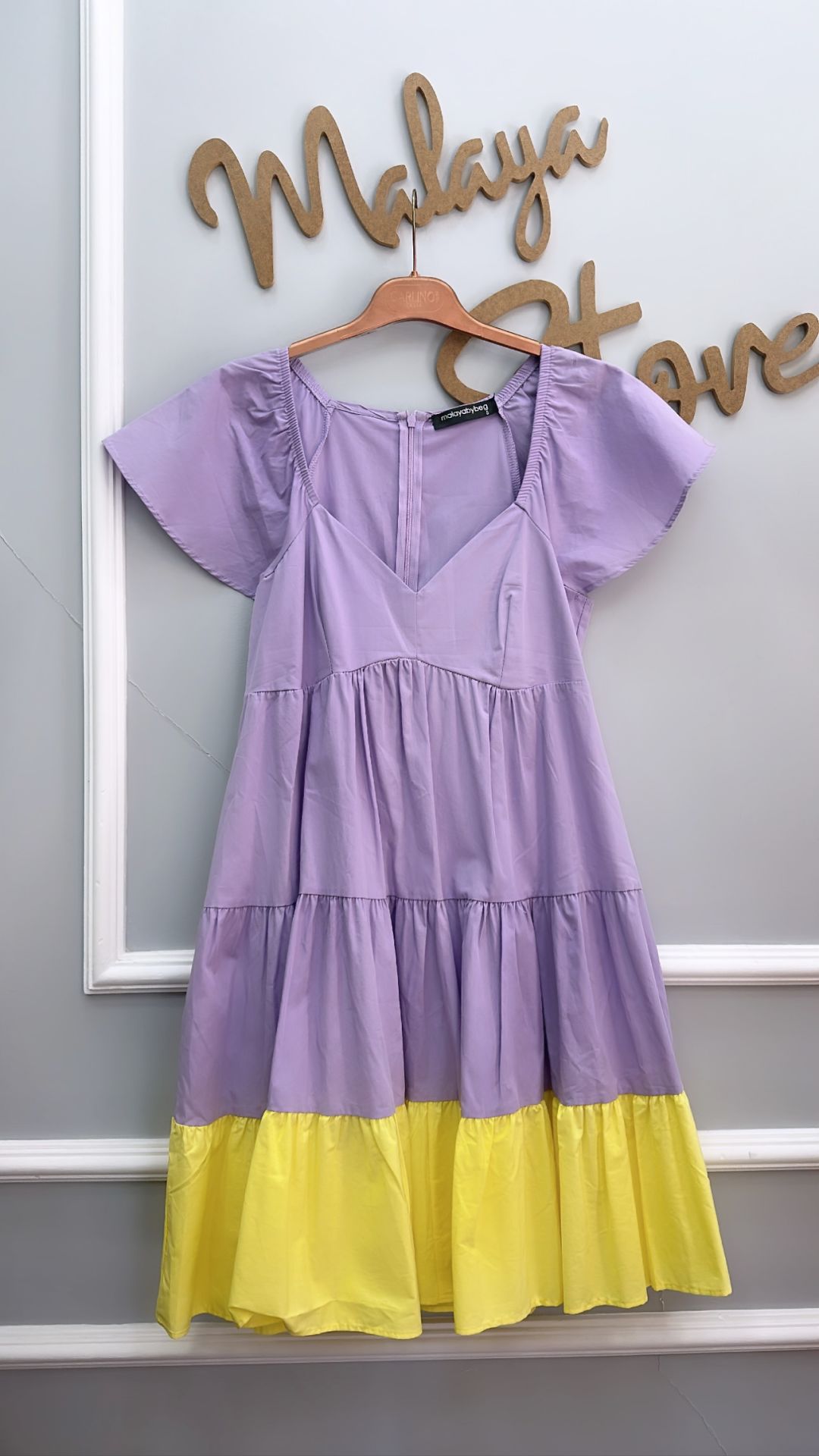A formunda, poplin kumaştan, iki renkli tam kalıp elbise.