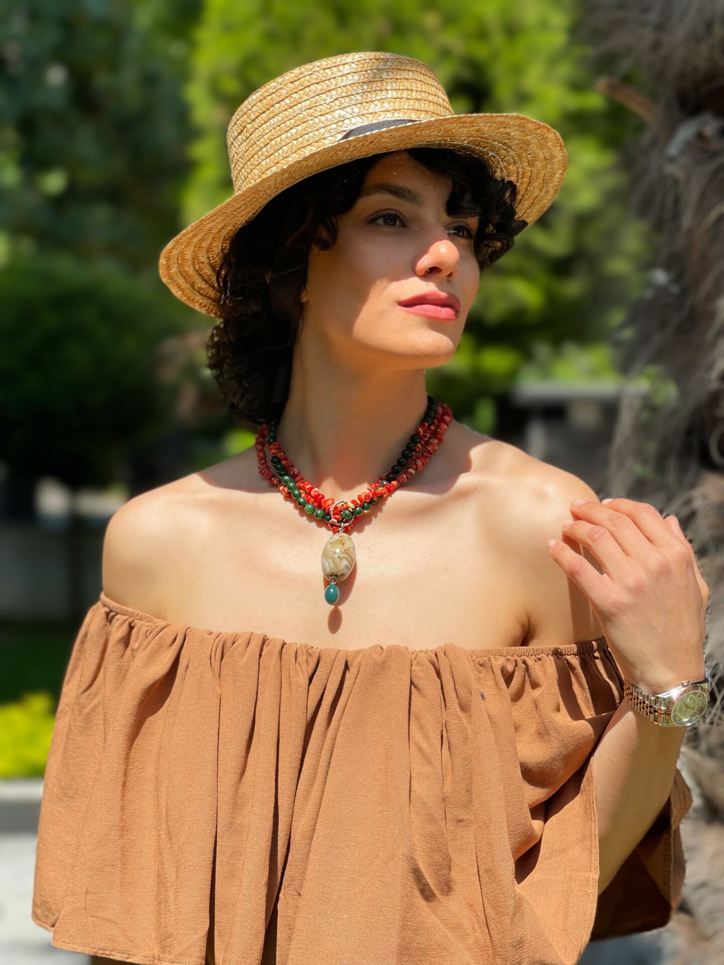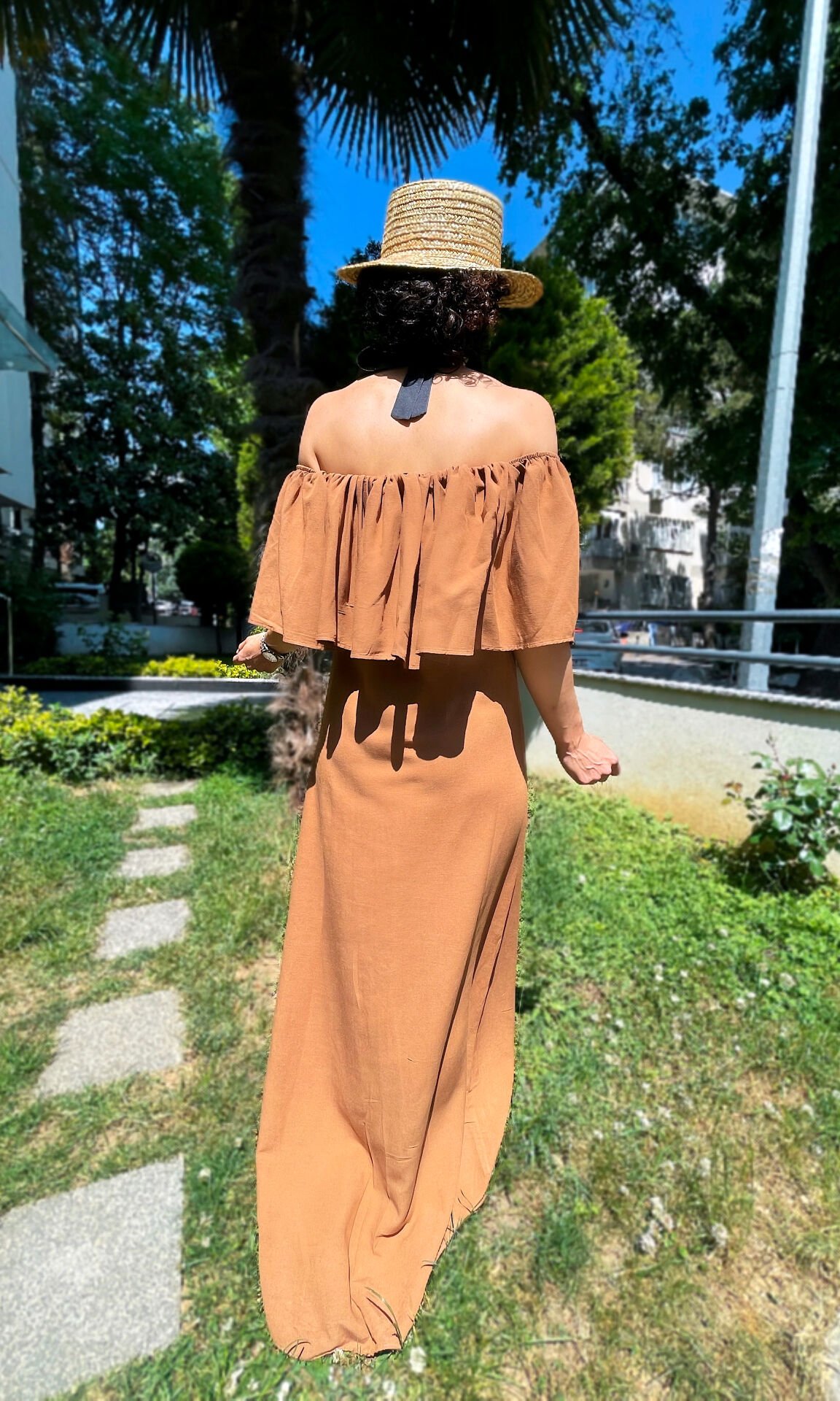 Carmen yaka, maksi boy, A formunda inen, geniş yapıda elbisedir. Üst kısmı lastiklidir ve oldukça geniştir. 38-40-42 bedenler için uygundur. Etek boyu volanlı, arkaya dogru uzun gelmektedir.