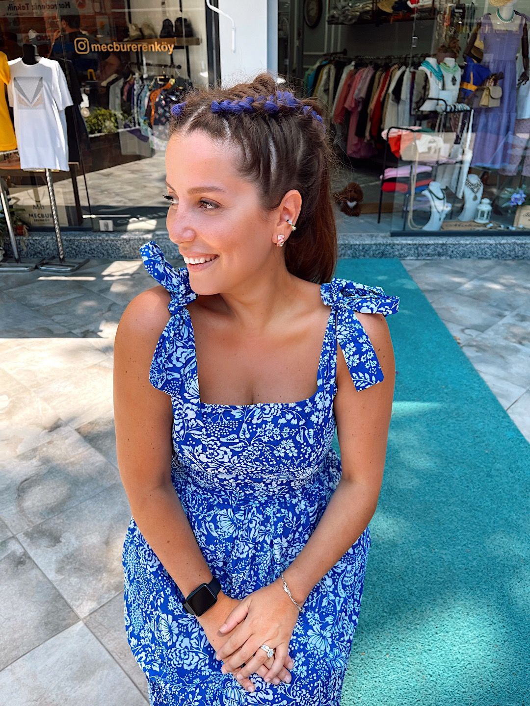 Omuz Detay Poplin Elbise - Mavi Çiçekli