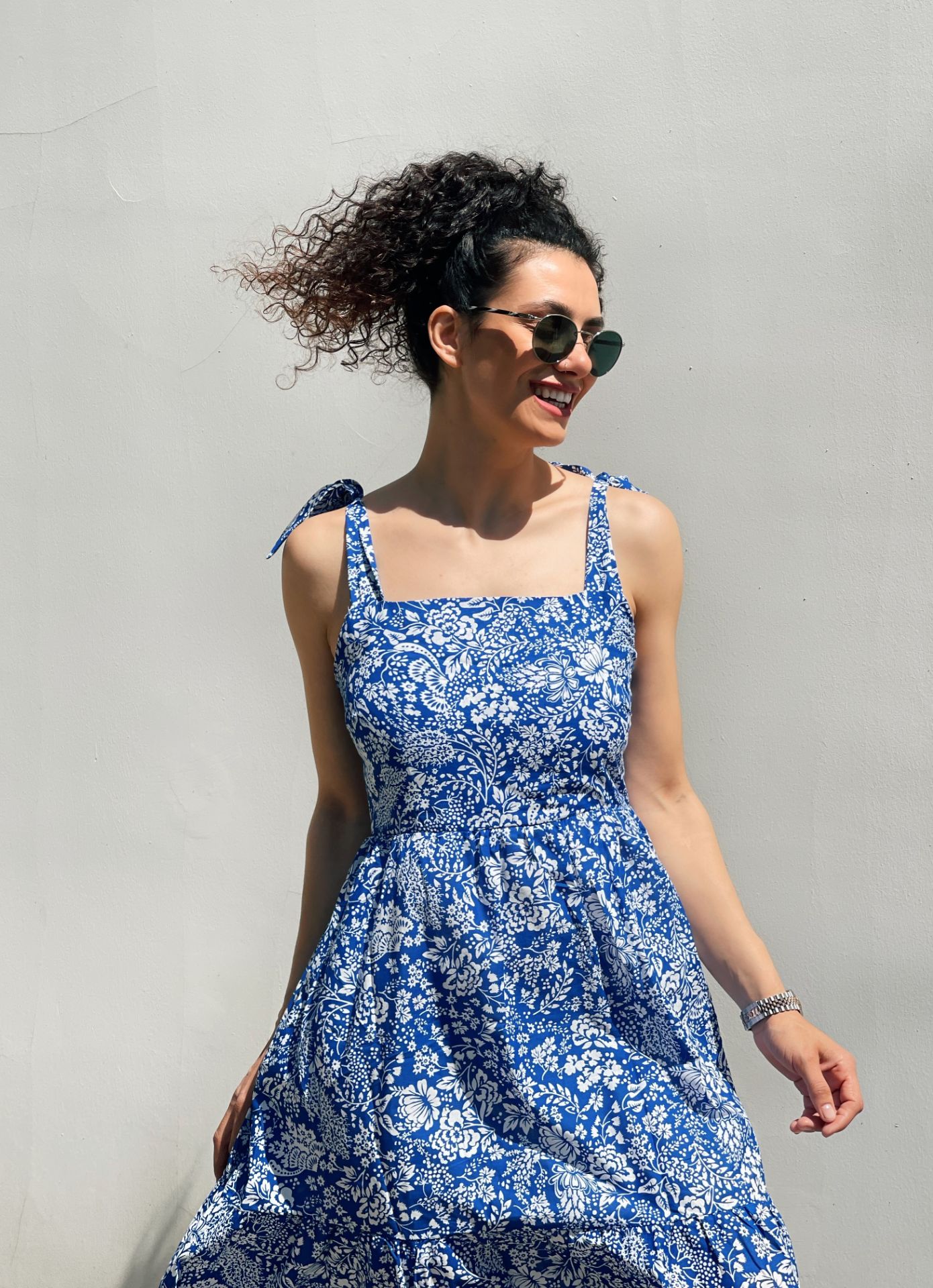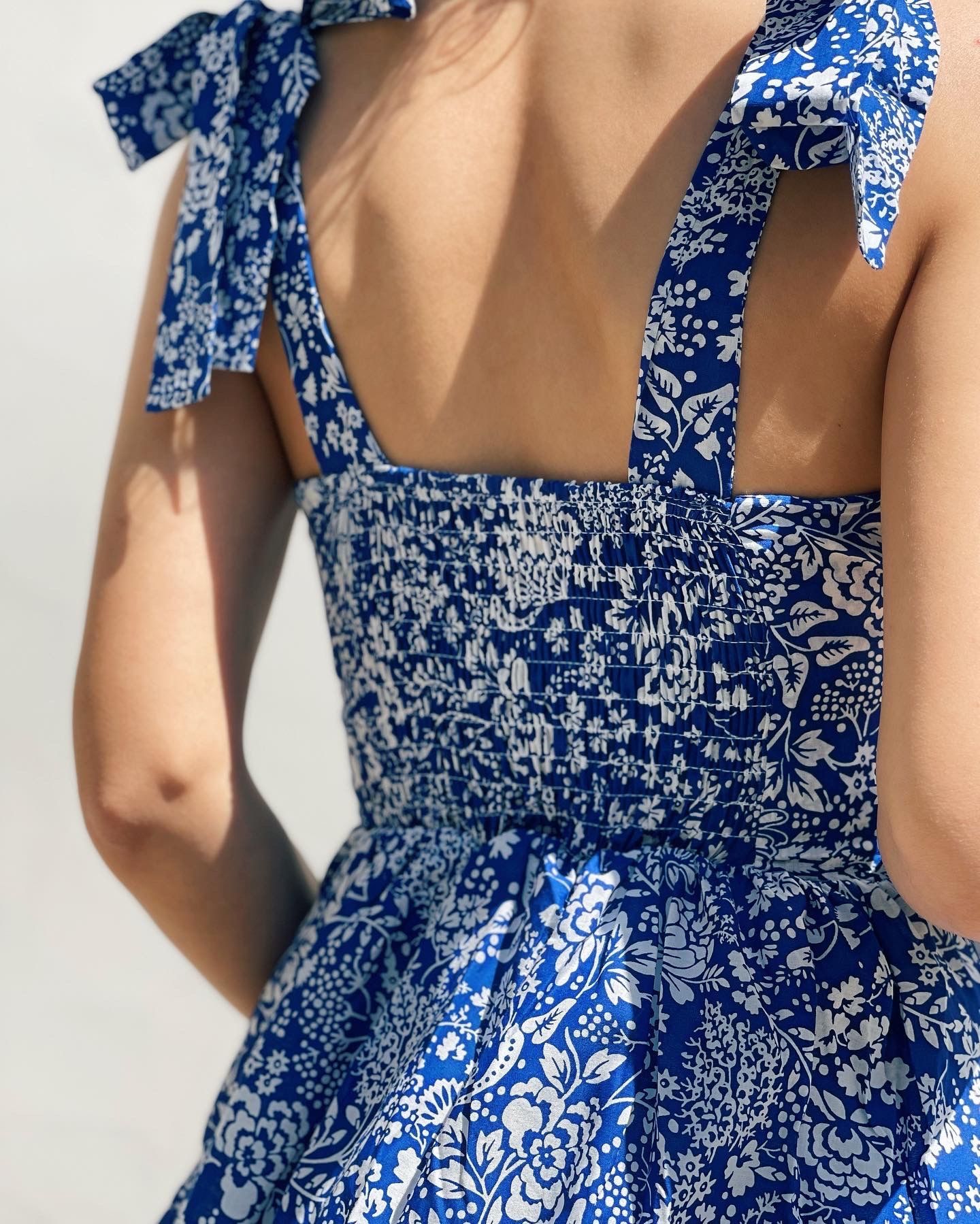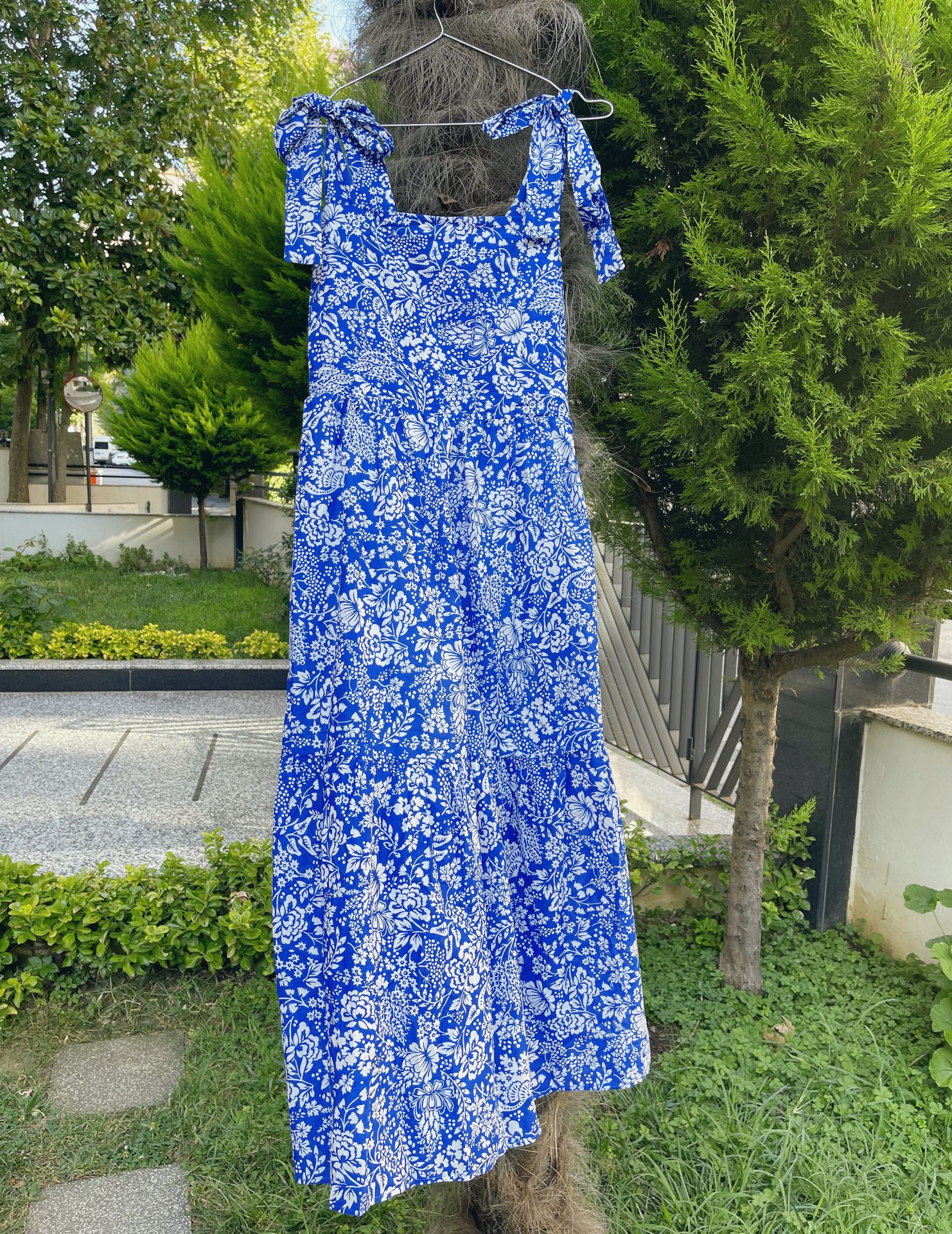 Poplin kumaş, omuzdan bağlama detay, sırt kısmı lastikli, midi boy elbise. Bedenlemesi tam kalıptır. İç göstermez.