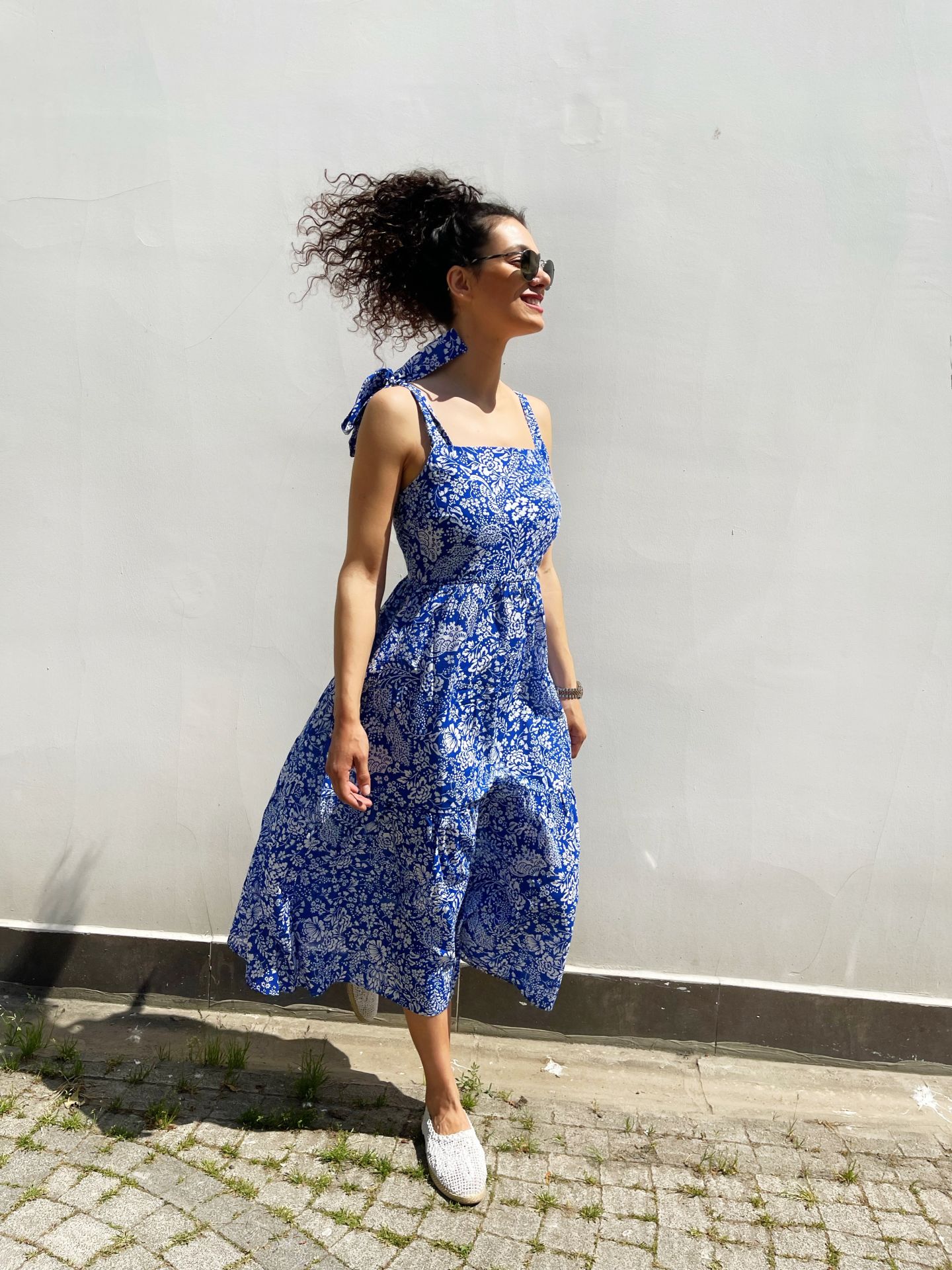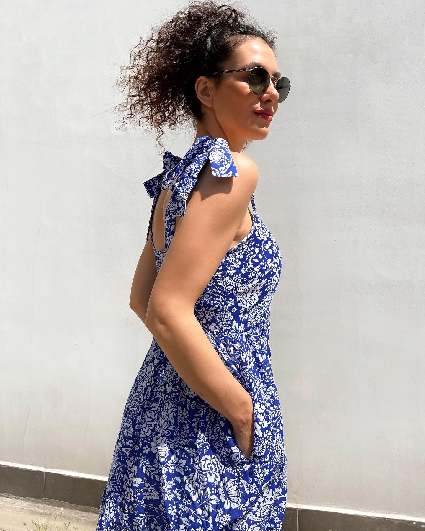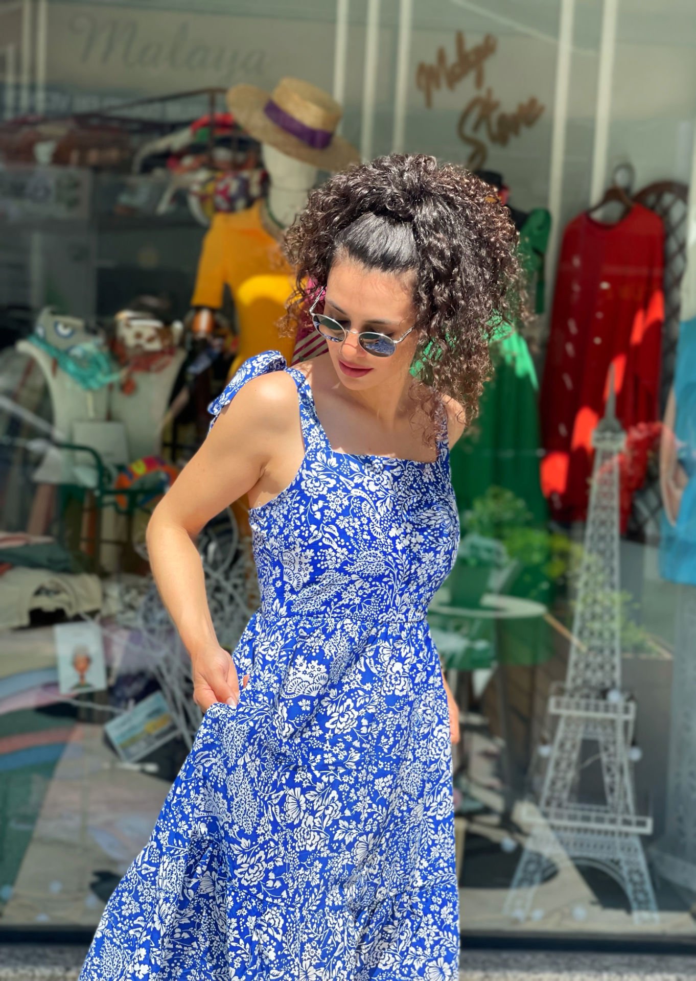 Poplin kumaş, omuzdan bağlama detay, sırt kısmı lastikli, midi boy elbise. Bedenlemesi tam kalıptır. İç göstermez.