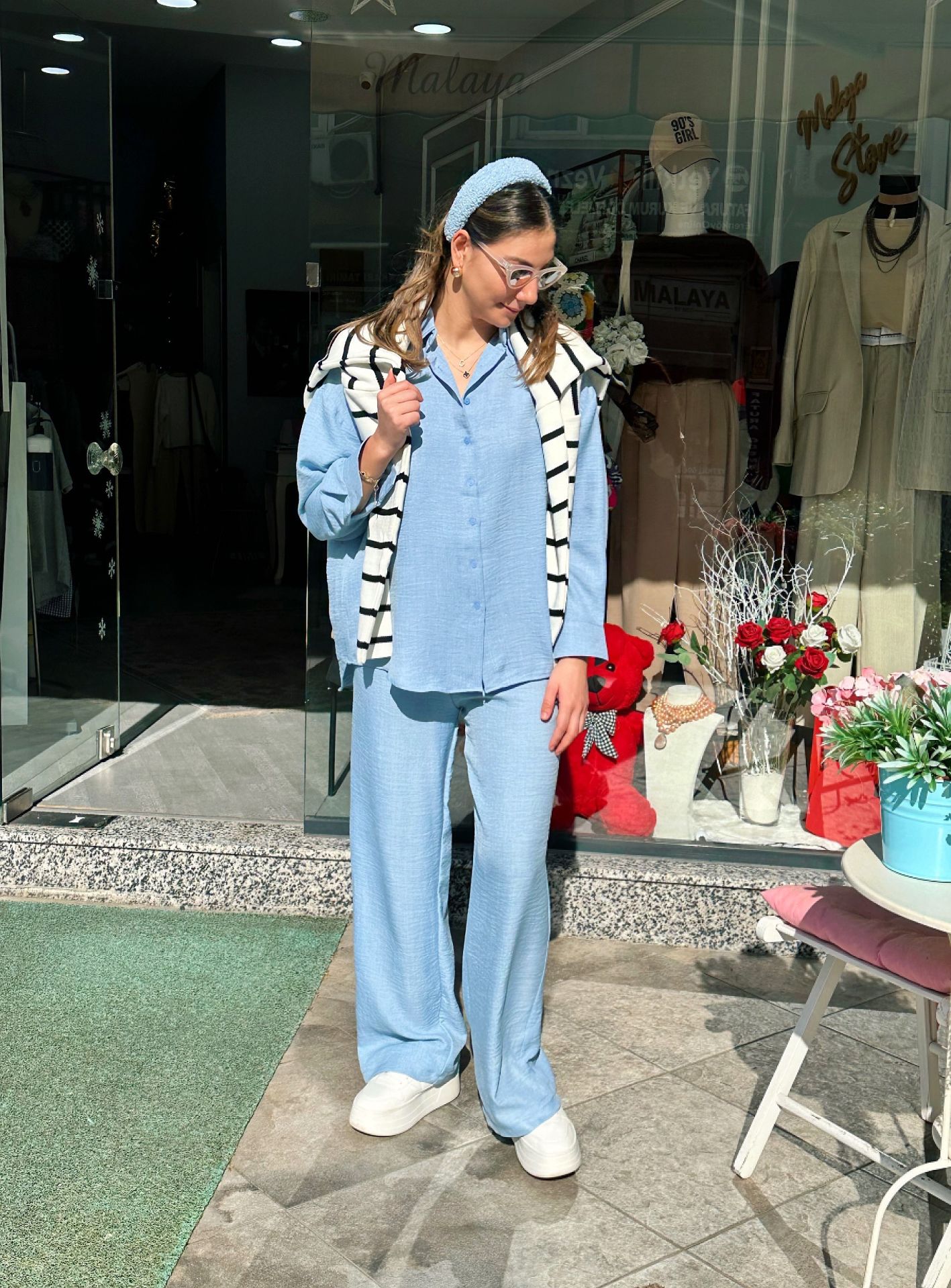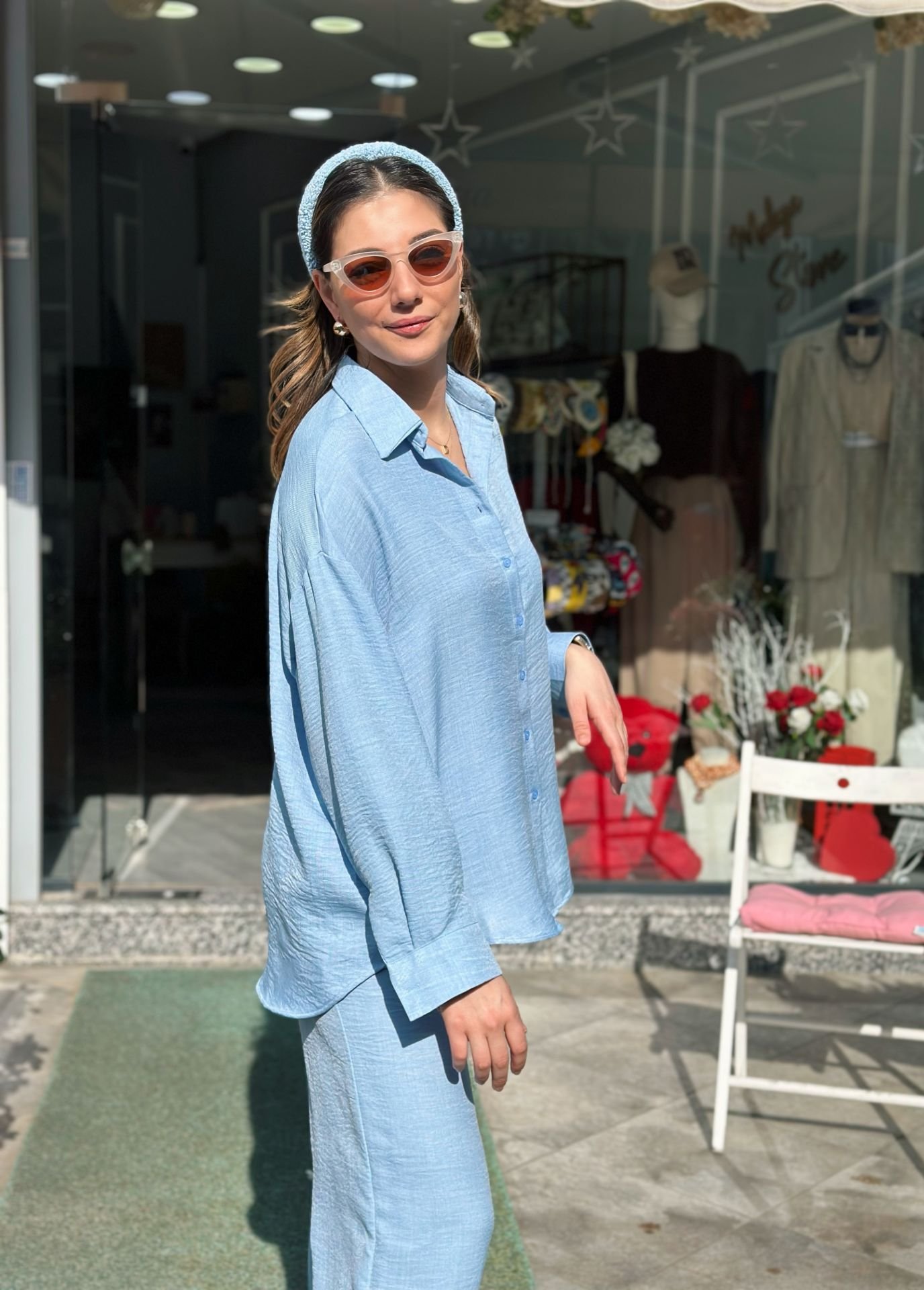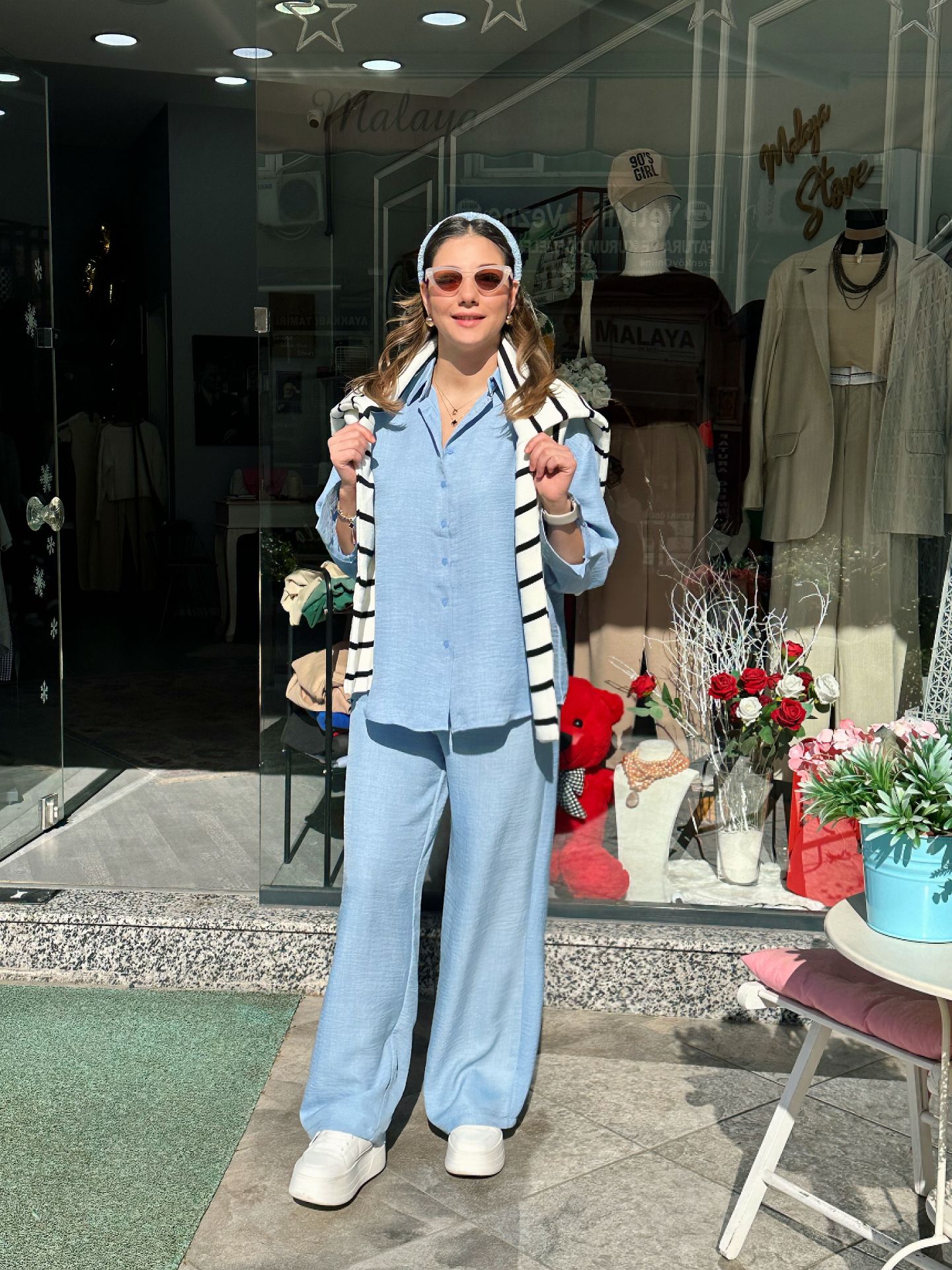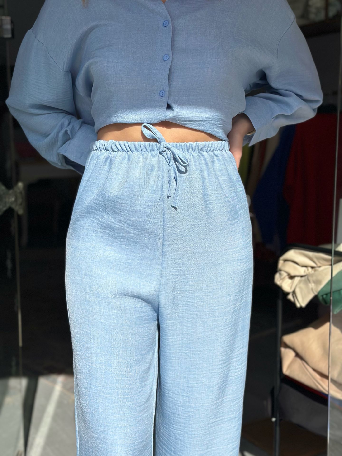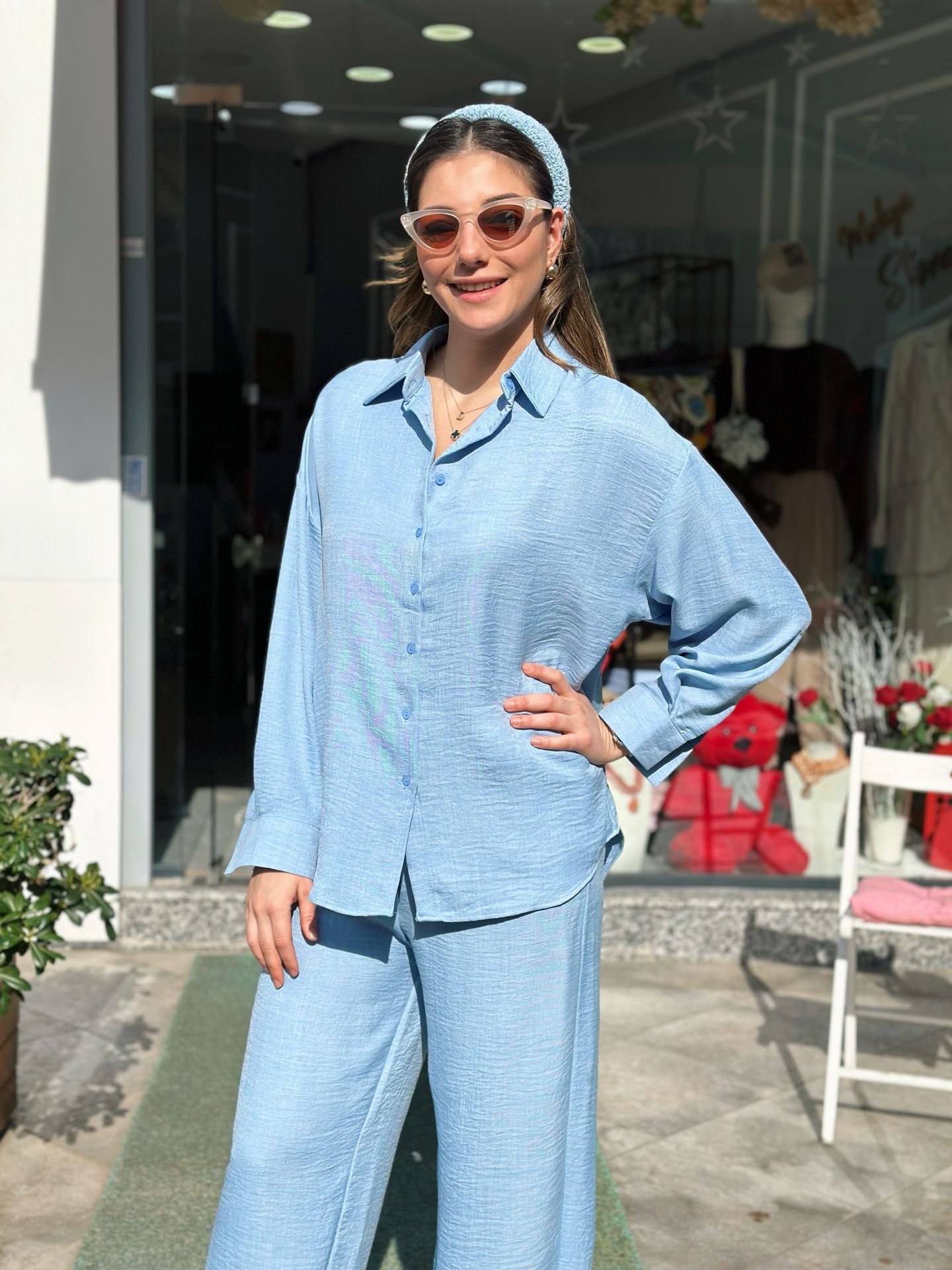 Tiril tiril, oldukça geniş ve rahat yapıda, bahar ve yaz aylarının vazgeçilmezi, yüksek bel ve lastikli pantolonu, dökümlü gömleği ile zamansız ikili takım.