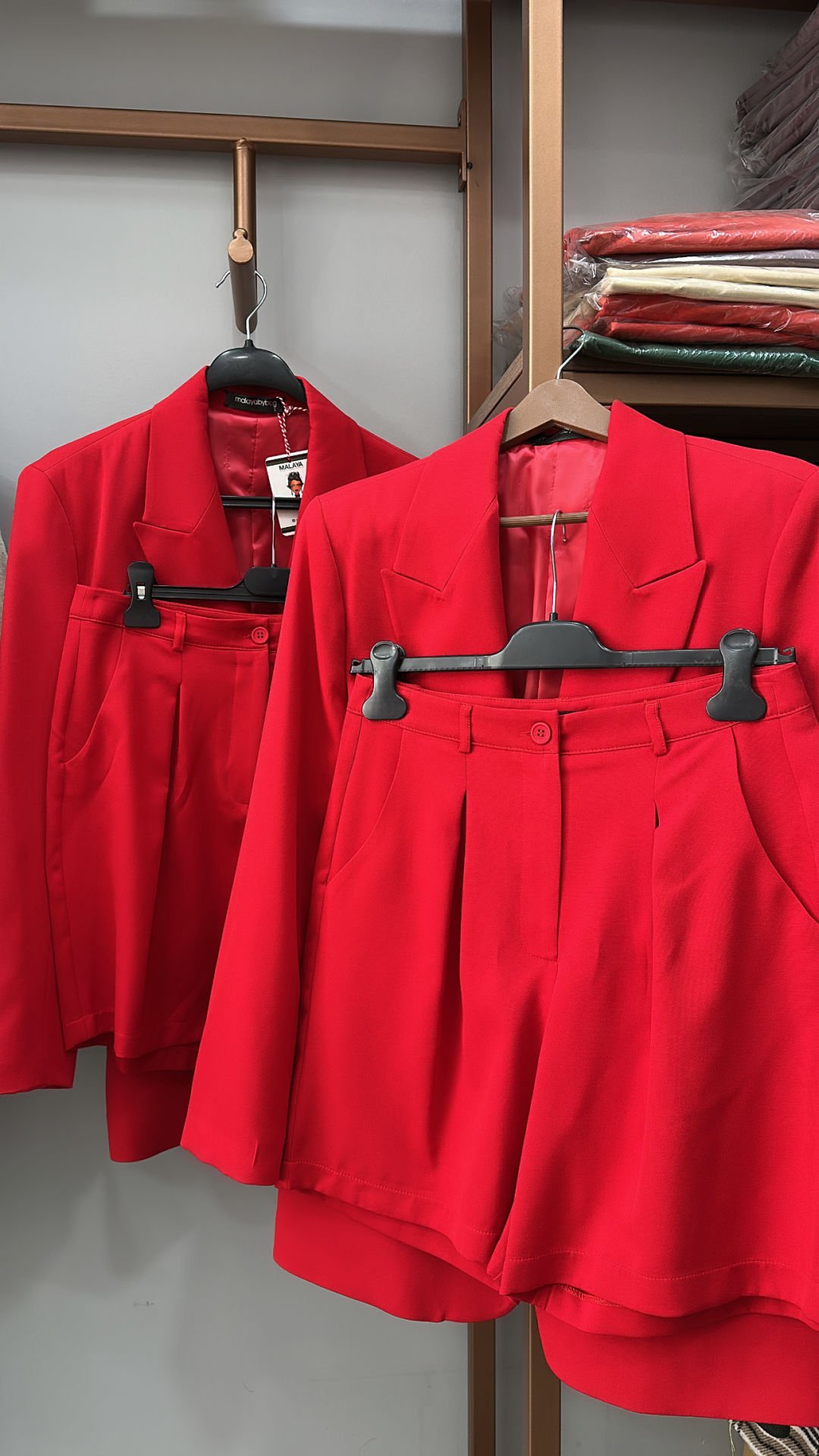 Bermuda şort formunda, ince krep kumaş, oversize blazer kesim ikili takım.